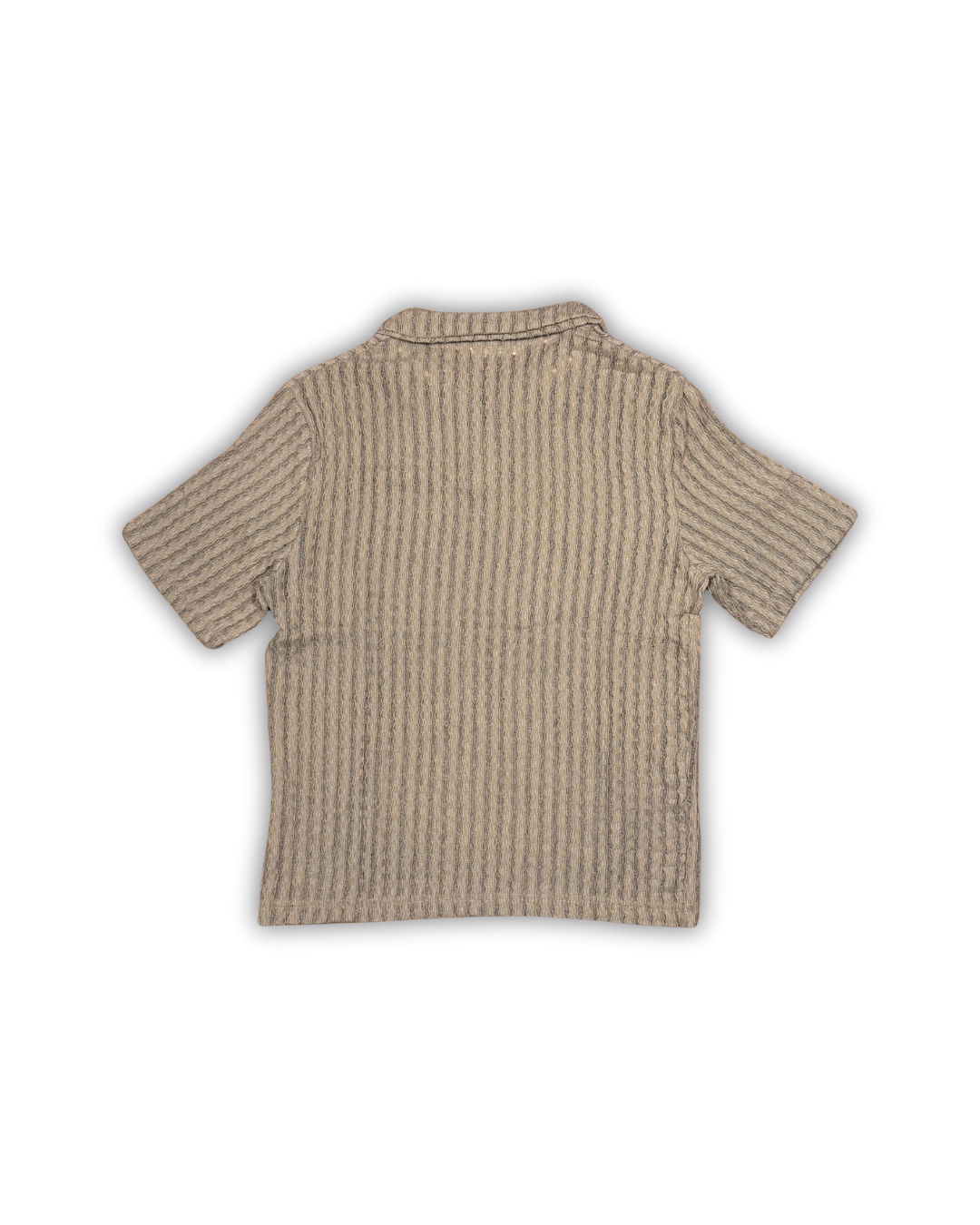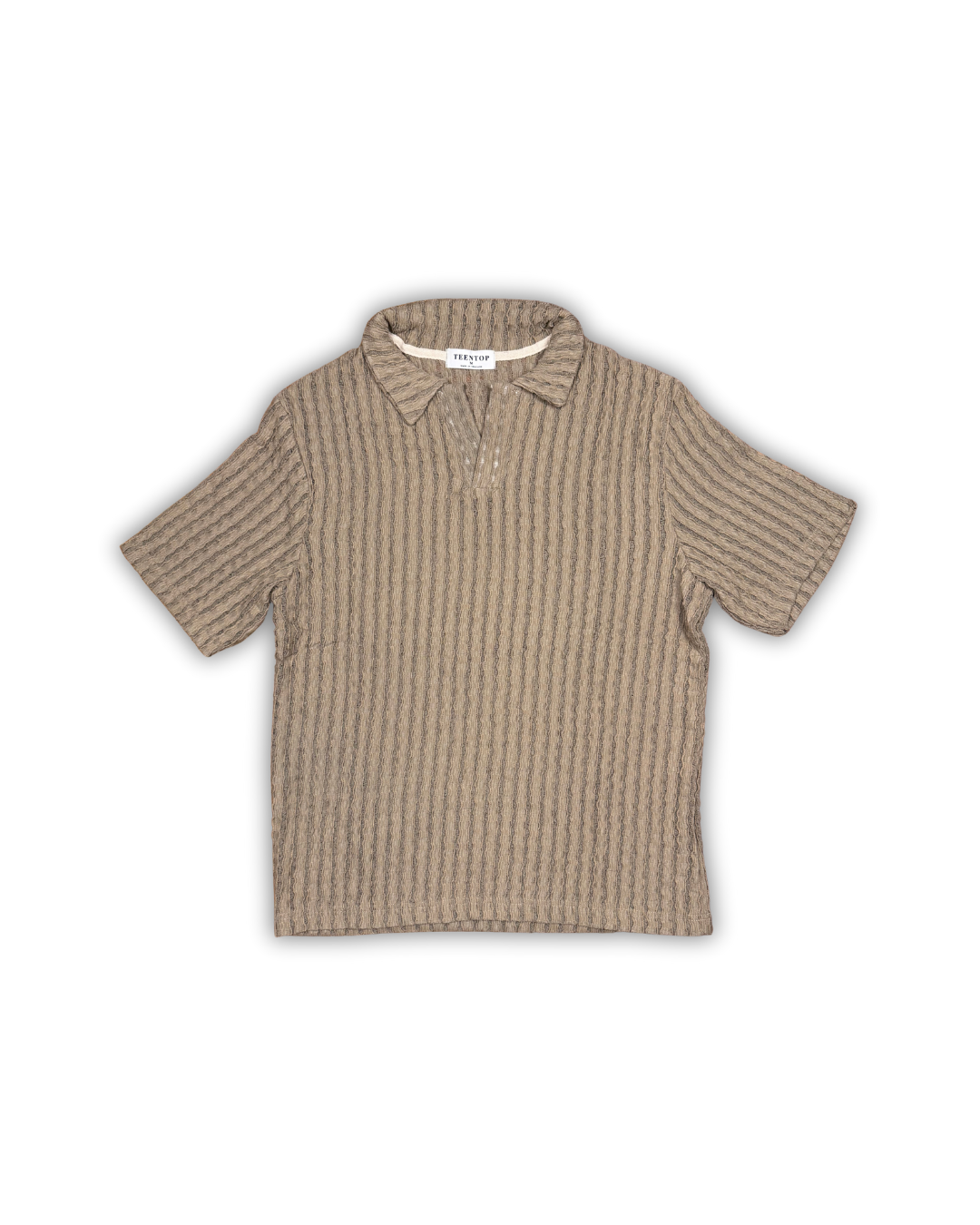 The Beige Textured Knit Open Collar Polo delivers a soft, neutral tone perfect for effortless styling. With its vertical knit texture and laid-back collar, it strikes the right balance between casual ease and timeless sophistication.