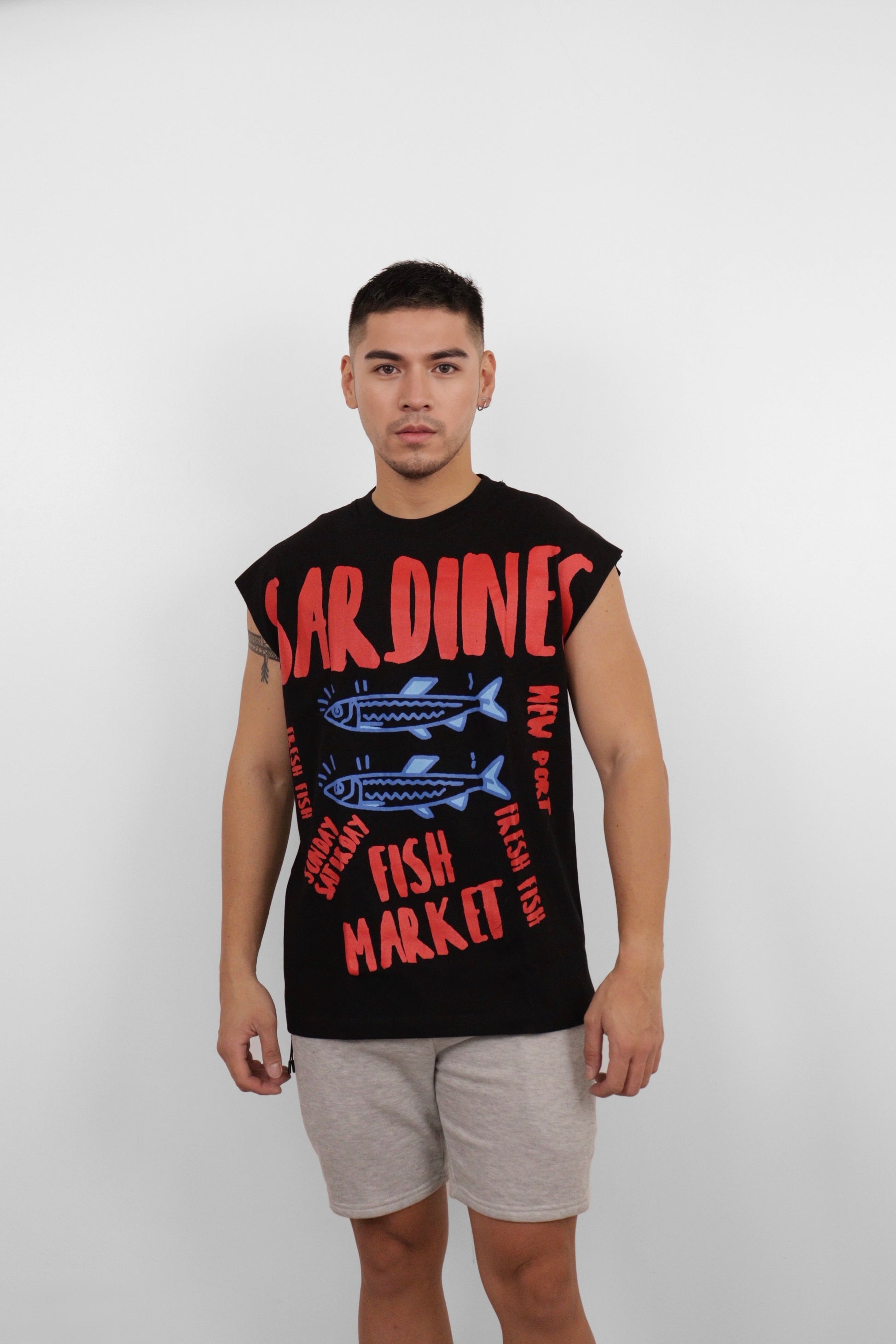 A bold graphic piece that makes a statement. The Black Sardines Fish Market Muscle Tee features playful sardine artwork in striking red and blue, inspired by vintage market posters. Sleeveless and relaxed, it’s a perfect summer-ready top with streetwear edge.