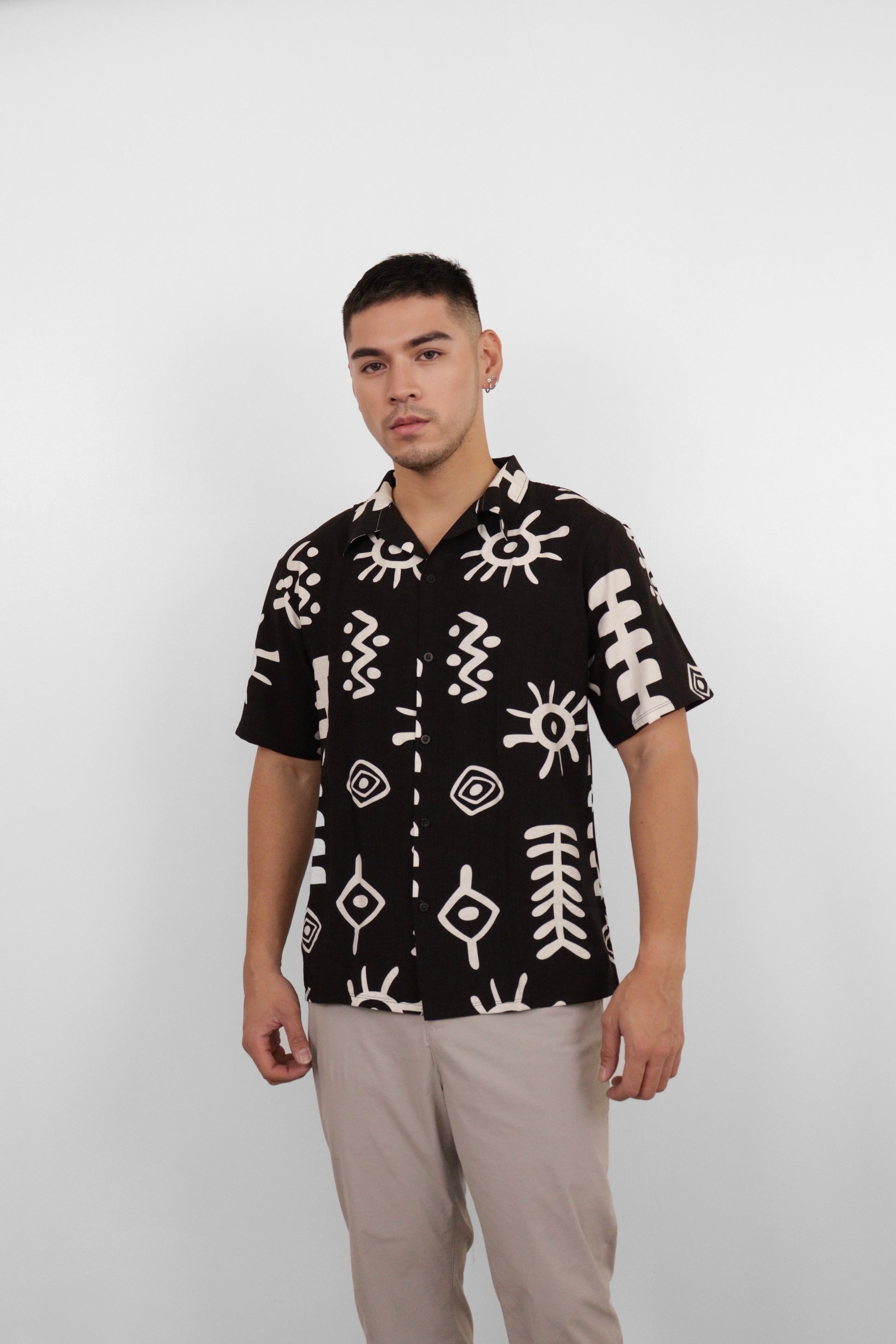 Dark and striking—the Tribal Vision Shirt in black flips the contrast with white tribal-inspired symbols. A statement piece that’s both modern and rooted in culture.