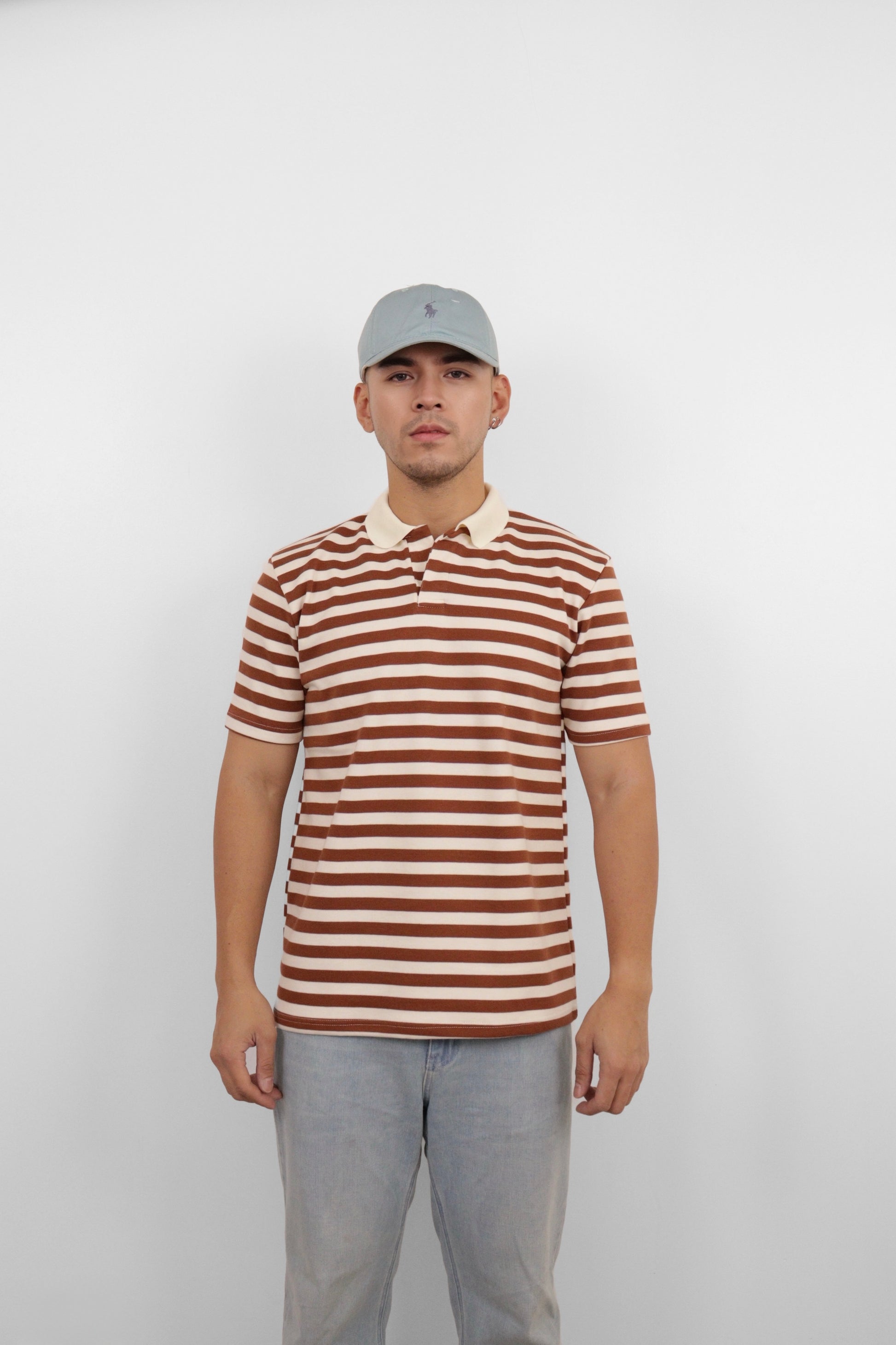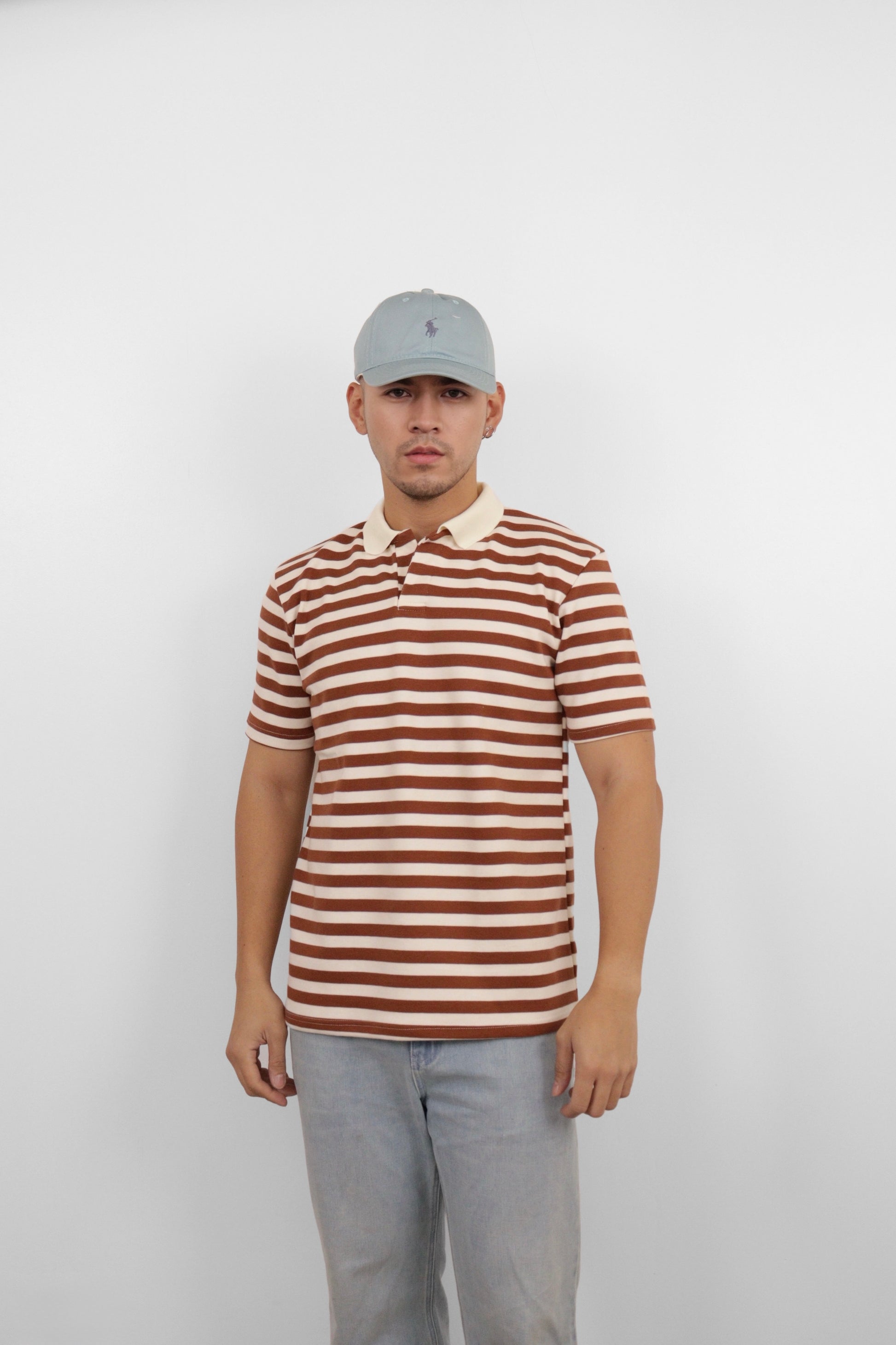 Grounded yet striking, the Brown Striped Polo brings earthy tones to a polished silhouette. Featuring wide brown and white stripes, it blends casual comfort with timeless sophistication.