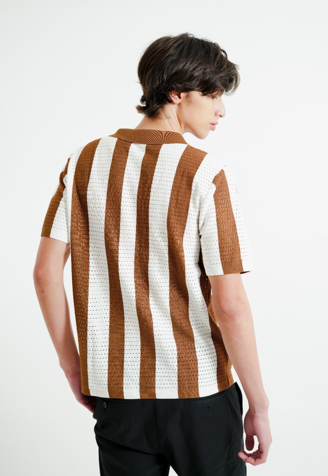 The Brown & White Vertical Stripe Crochet Polo is a bold yet breathable statement piece. With its open-knit texture and alternating brown and white stripes, it delivers a retro-inspired look that’s perfect for warm days and stylish nights.
