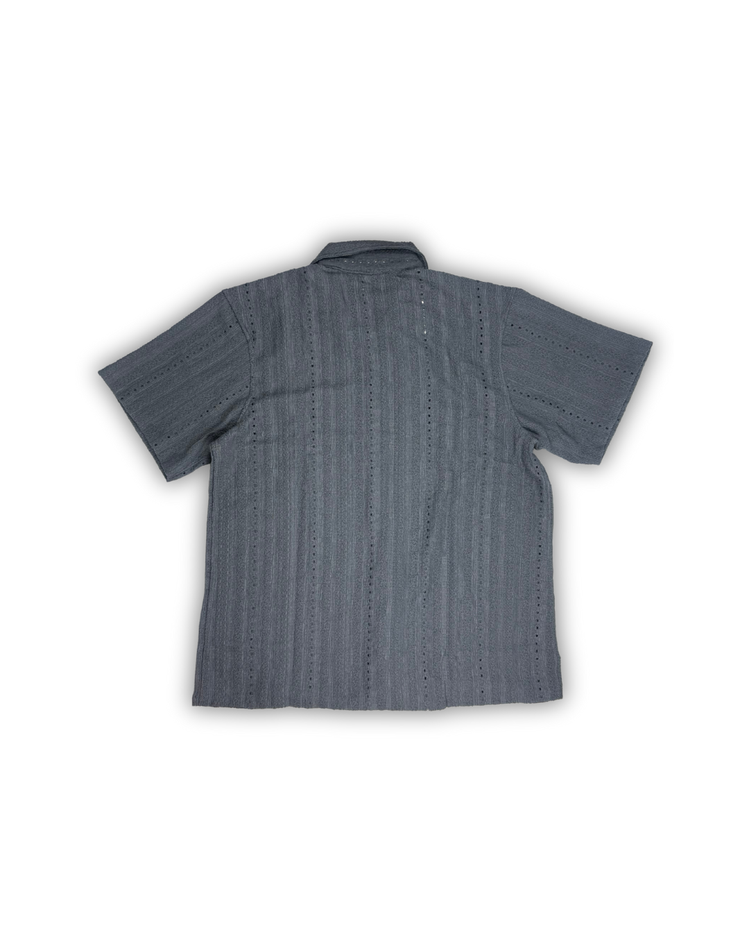 Lightweight short-sleeve shirt in gray textured fabric with subtle openwork detail. Designed with a relaxed silhouette and camp collar for a clean, contemporary look.
