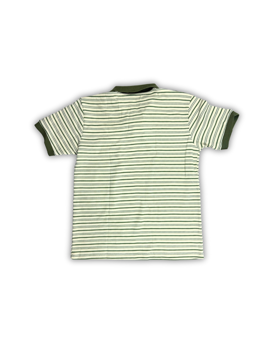 A retro-inspired polo shirt with a modern twist. Featuring fine horizontal stripes across the body, this piece is accented with a solid green contrast collar and sleeve hems. The lightweight knit fabric offers a structured yet breathable fit, making it versatile for both casual outings and refined layering.
