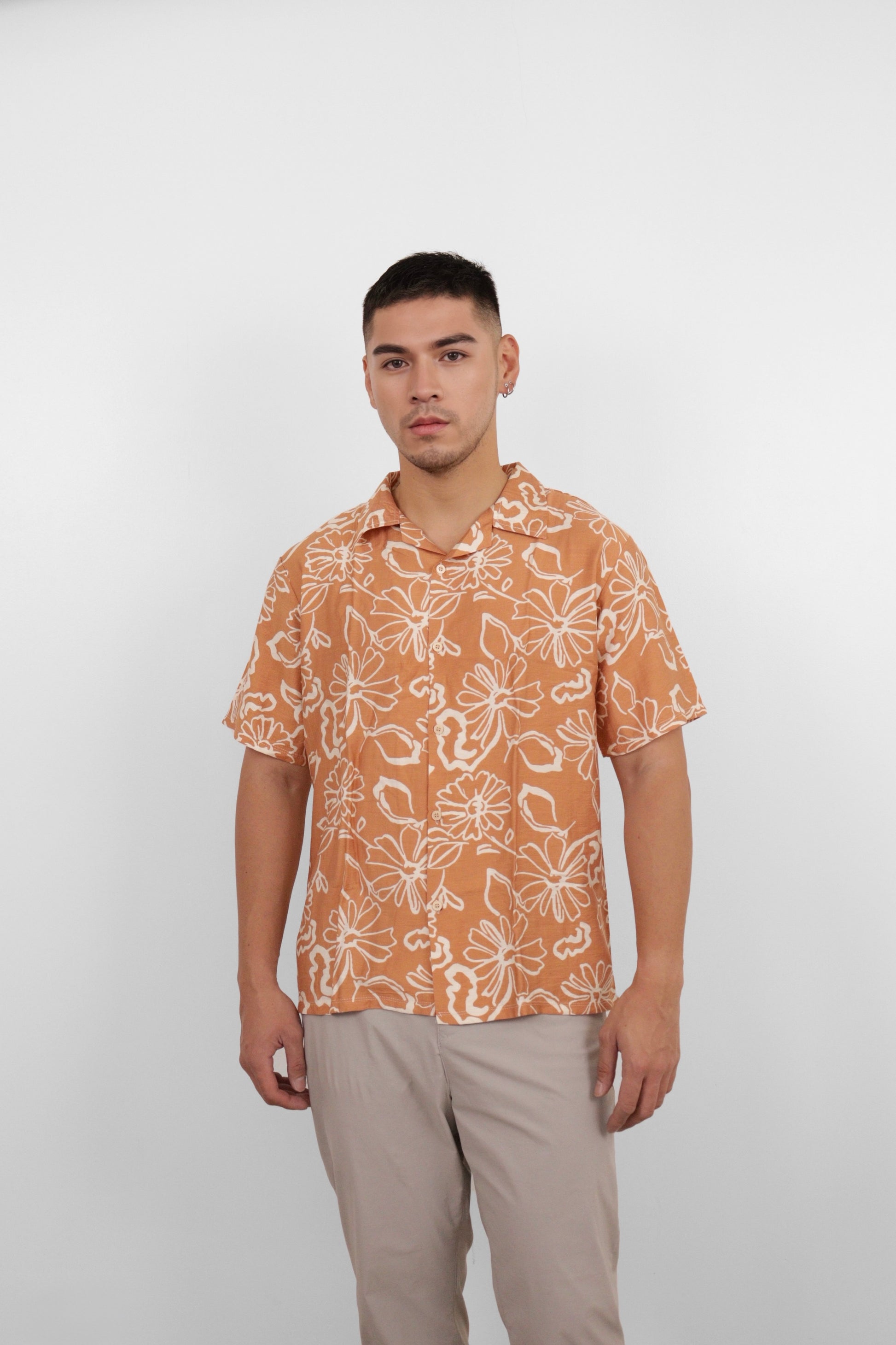A modern take on resort wear, the Rust Floral Camp Shirt is cut in a rich rust tone with bold cream floral prints. The flowy pattern and relaxed silhouette give it effortless sophistication.