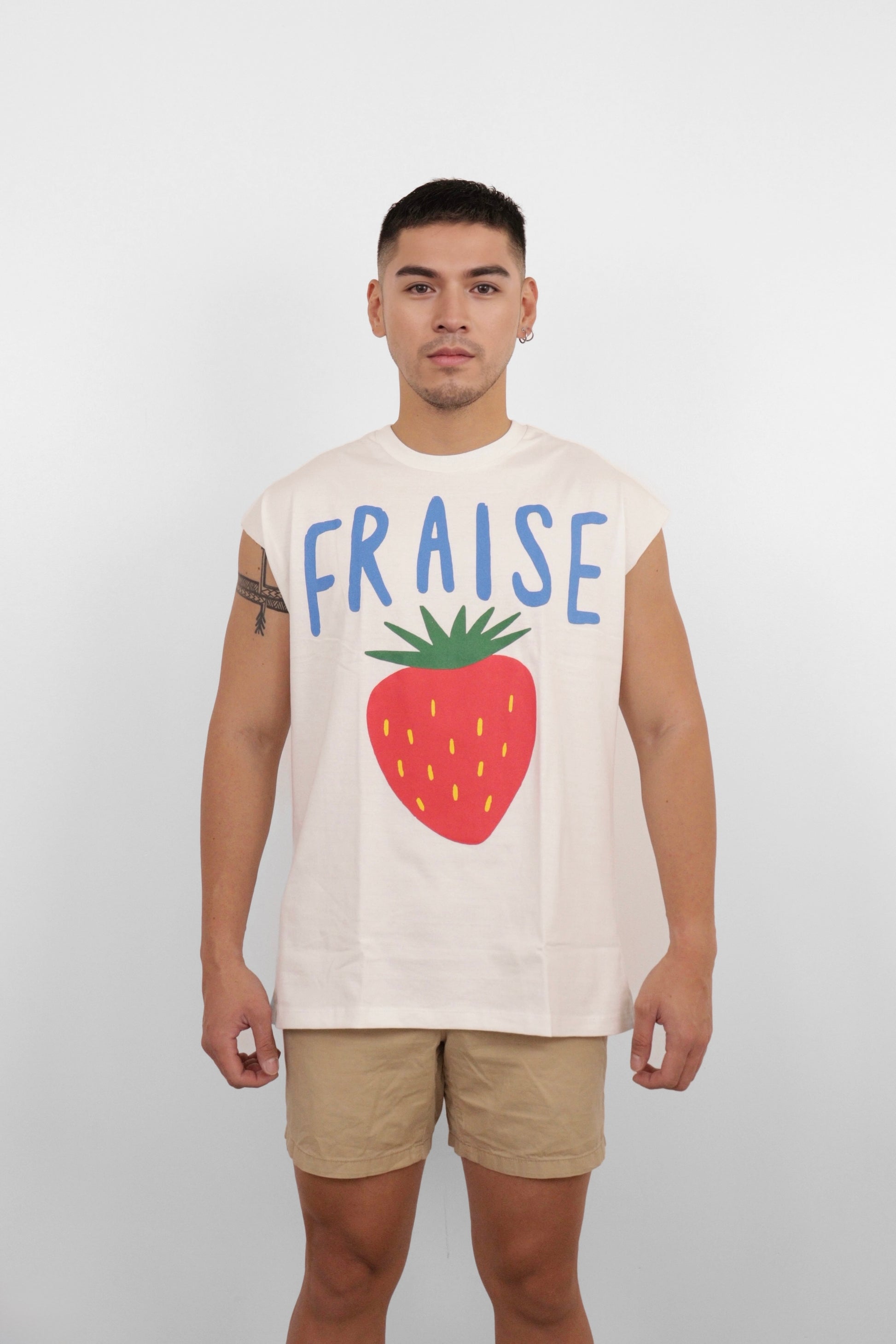 Fresh and playful. The White Fraise Graphic Muscle Tee features a bold strawberry motif with the French word “Fraise” in vibrant blue. A cut-off silhouette gives it a modern streetwear edge, while the pop-art inspired print adds a touch of charm.