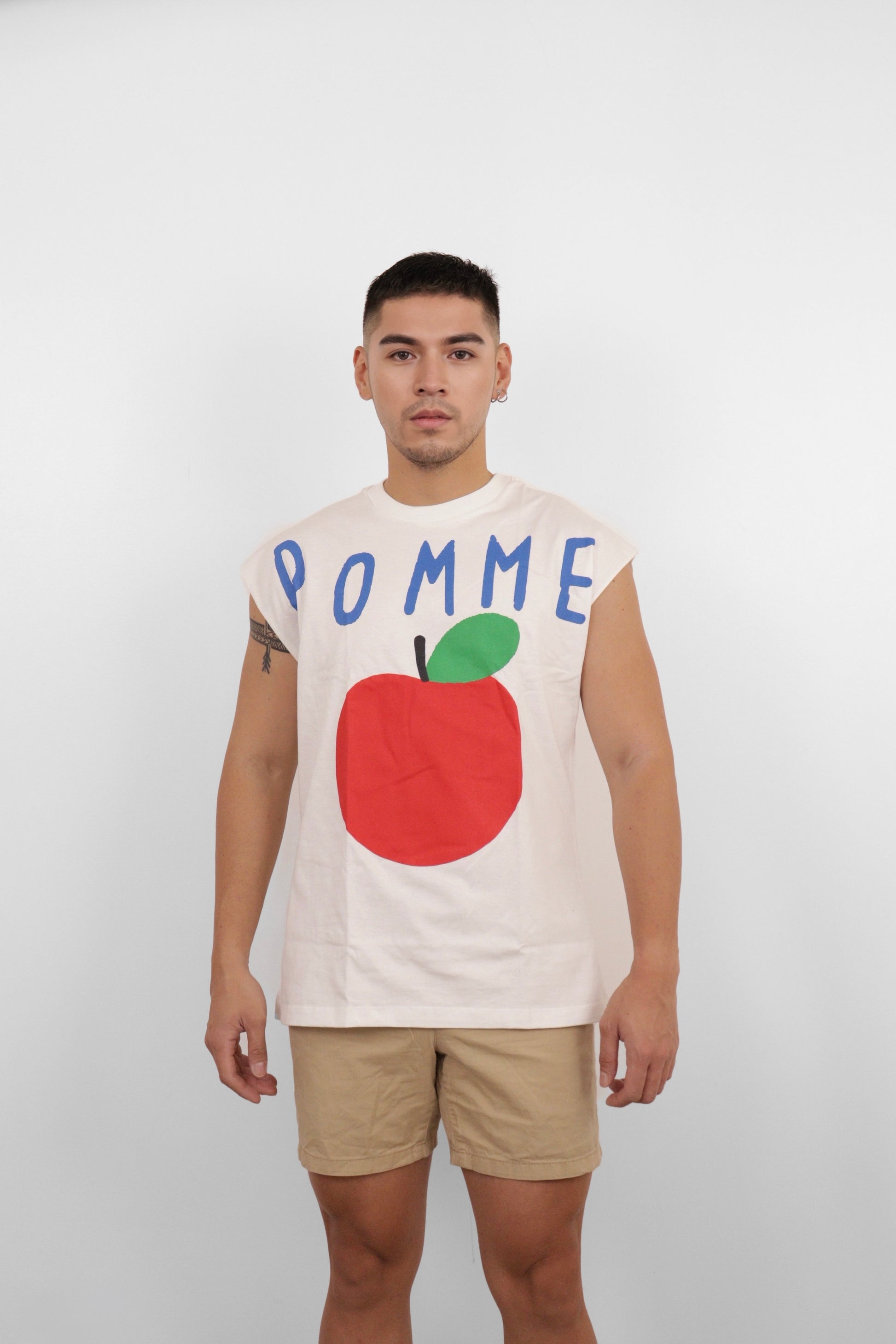 Minimalist with a playful twist. The White Pomme Graphic Muscle Tee showcases a bold apple motif with the French word “Pomme” in striking blue lettering. Its cut-off silhouette and clean design make it a standout everyday piece.