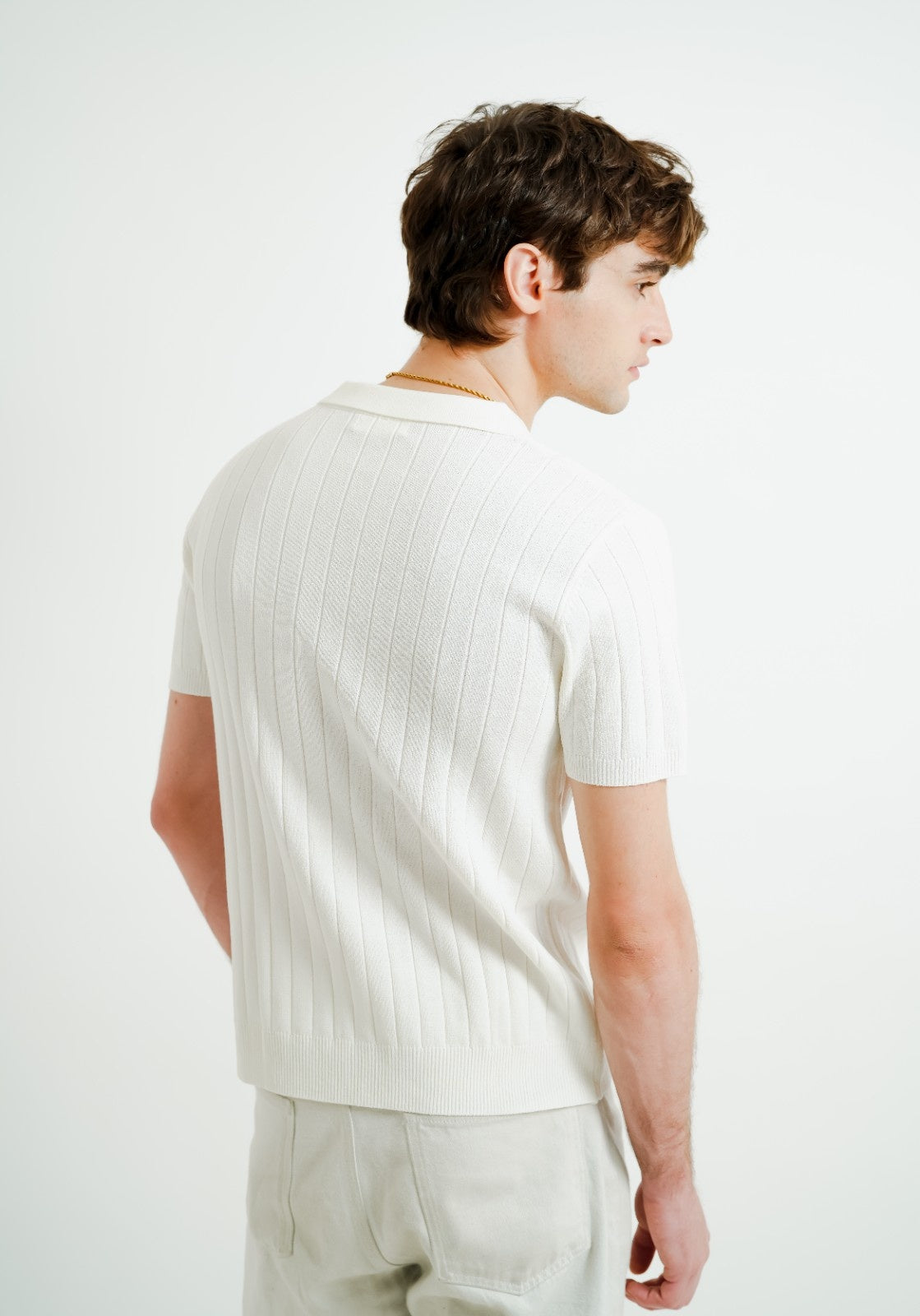 The White Ribbed Knit Polo brings a crisp, refined look to your wardrobe. With its vertical rib texture and sleek collar design, it’s a modern minimalist piece that pairs effortlessly with almost anything.